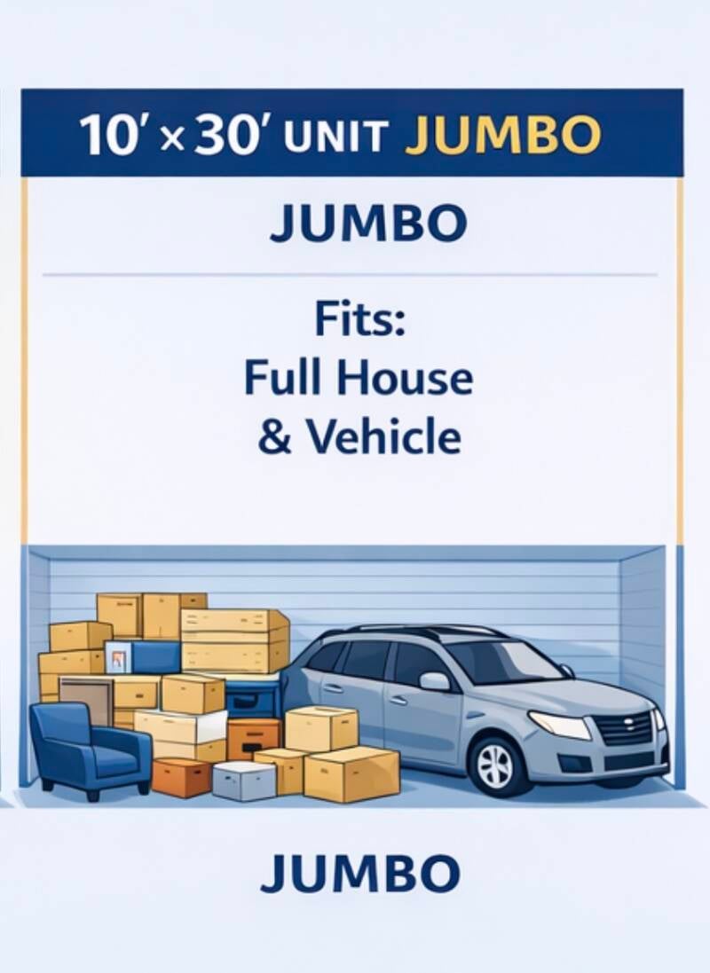 Suitable for storing the contents of a multi-bedroom house, including furniture, appliances, and larger items. Door width is 7'. Direct drive up access.